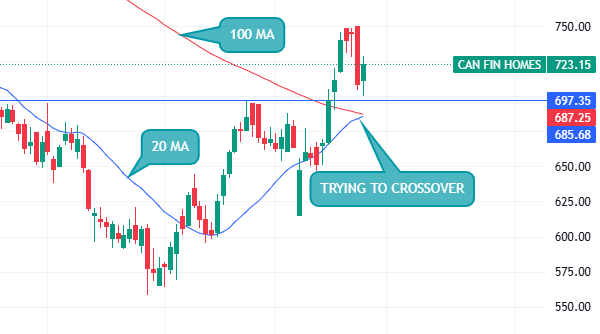 The Can Fin Homes Chart Pattern is currently displaying a promising Cup with Handle pattern, a classic bullish continuation signal in technical analysis. This pattern typically indicates a potential upward movement, with the “cup” representing a rounded consolidation phase and the “handle” signifying a brief pullback before the breakout. Adding to the optimism, the 20-day moving average (20 MA) is attempting to cross over the 100-day moving average (100 MA). Such a crossover often signals a shift in momentum, suggesting that the stock might be gearing up for a strong rally. Traders and investors should monitor these technical indicators closely, as they could provide valuable insights into the stock’s future trajectory.