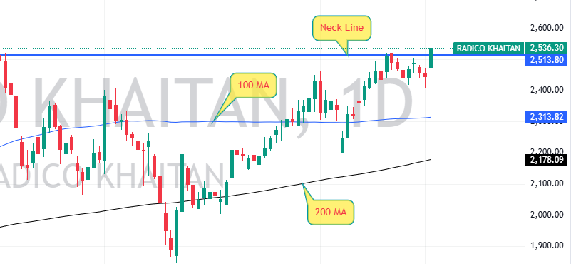 Radico Khaitan has established itself as a dominant player in the Indian spirits industry, boasting eight millionaire brands and a strong presence in premium and luxury liquor segments. The stock is currently trading at βΉ2,538, with a market cap of βΉ33,964 Cr. Investors are keenly watching Radico Khaitan Share Price and its Cup with Handle Pattern and 100MA above 200MA, signaling potential bullish momentum.